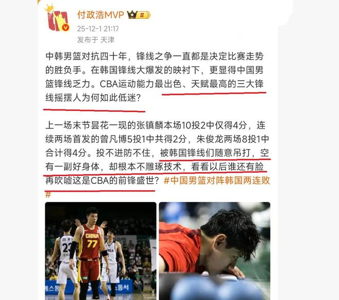 国内篮球解说员付政浩,也是对中国男篮的表现进行了点评,他认为中国男篮与韩国队的比赛,锋线是决定比赛胜负的关键!中国男篮拥有三大顶级锋线球员,号称运动能力最出色,天赋最高,然而,三大锋线没有一个表现正常。