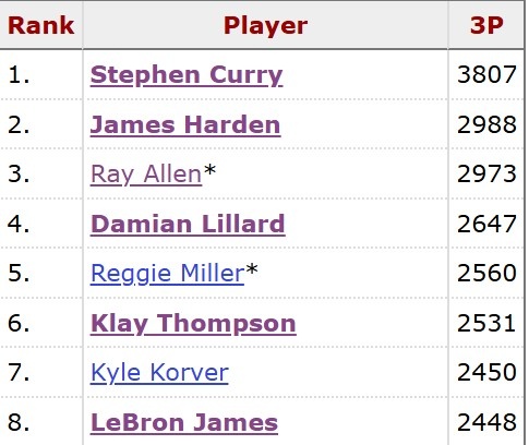 目前,詹姆斯常规赛生涯已经投中了2448记三分,暂列历史第八,差2记追平科沃尔。