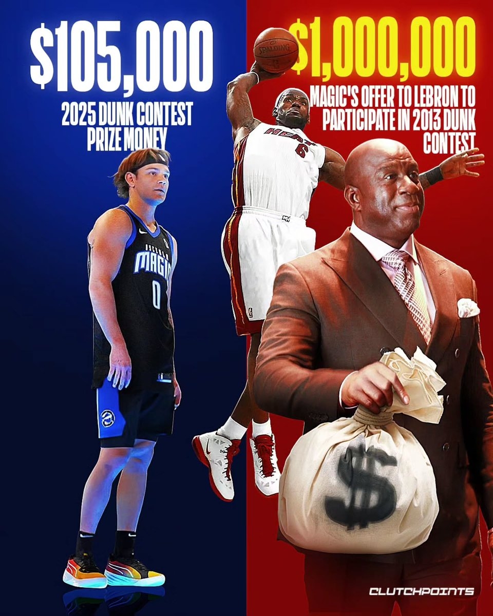 2013年,魔术师表示愿意出100万美元让詹姆斯参加扣篮大赛,后者考虑了一下但最终还是拒绝了。作为对比,今年麦克朗扣篮大赛夺冠,奖金是105000美元。