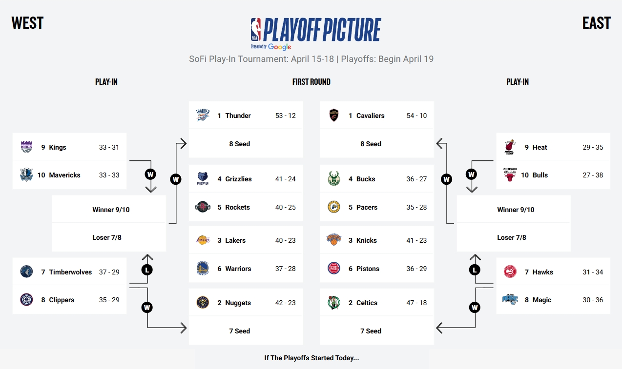 目前排名下的季后赛对阵情况西部排名:湖人遭掘金反超跌至西部第三,灰熊和湖人的胜场差持平,西部第五的火箭仅落后湖人&灰熊1个胜场,勇士西部第六,爵士无缘季后赛、附加赛东部排名
