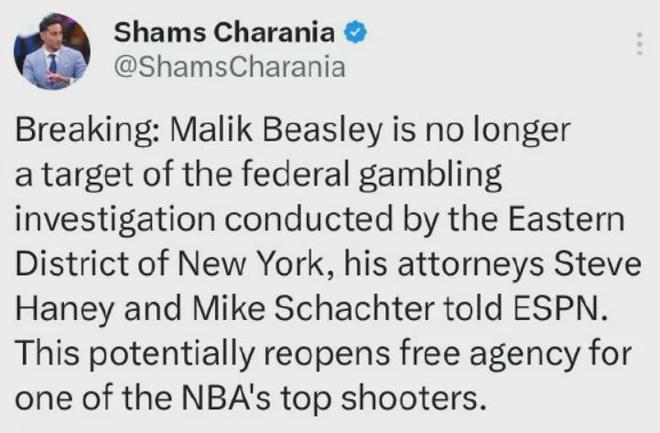 爆料王Shams:比斯利不再是赌球调查的对象,或将重返自由市场。值得一提的是,比斯利原本准备和活塞达成为期3年价值4200万美元的续约合同,但由于赌球风波的影响该笔签约泡汤了,另外