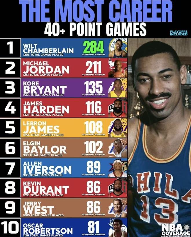 NBA40+得分榜出炉!张伯伦比率高达23.6%科比在列詹姆斯数据意外