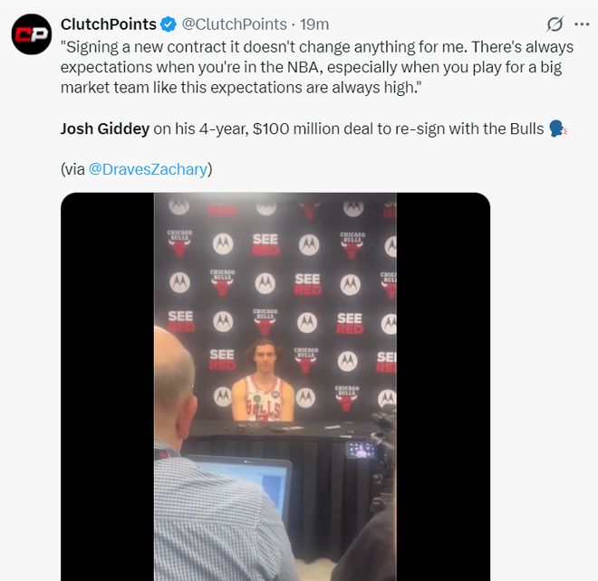 吉迪也回应了签下这份亿元长约:对于我来说新签下一份合同没有什么不同,在NBA打球总是会有各种期待,尤其是在芝加哥这样的大球市打球时,人们的期望总是很高,我来这里后就觉得这里有家的感觉,我很喜欢待在这里。