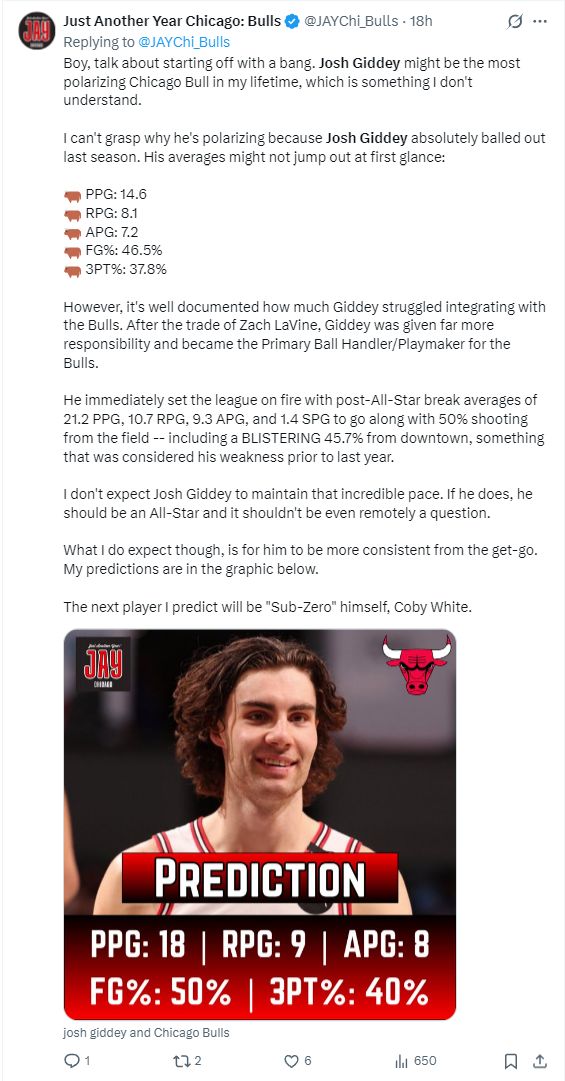 芝加哥媒体写道,吉迪上赛季已经场均14.6分8.1篮板7.2助攻1.2抢断0.63盖帽,在全明星周末后更是场均212分10.7篮板9.3助攻1.4抢断,我们相信他新赛季有希望拿到场均18分9篮板8助攻,命中率50%,三分命中率40%的数据入选全明星。