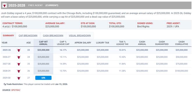 今夏公牛给了吉迪一份四年1亿的续约合同,这份合同没有球员选项也没有球队选项,这份合同是全额保障,一开始公牛只想给四年8800万,而吉迪想要五年1.25亿,最终双方各退一步选了折中的方案。