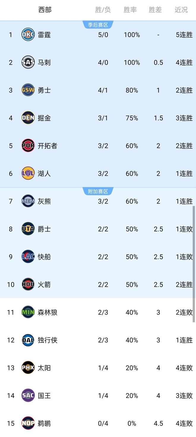 除了上面所说的2场比赛外,灰熊在莫兰特的率领下,以114:113准绝杀太阳,掘金则以122:88大胜鹈鹕,约基奇轻松拿到21+12+10的三双。此外,杜兰特状态回暖,砍下31分5篮板,帮助火箭以139:121大胜猛龙。下面是西部各球队具体排名,雷霆和马刺依旧保持不败金身,分别排名前二,勇士则4胜1负高居第3。