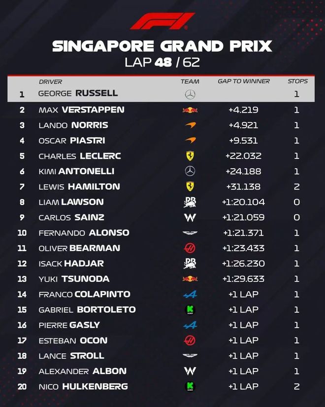 - 北京时间10月5日,F1新加坡大奖赛正赛结束。拉塞尔杆位夺冠,维斯塔潘第2,诺里斯第3,皮亚斯特里第4,安东内利第5,勒...发表于: 10-06 20:19