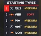 起步轮胎方面,前十名车手中仅维斯塔潘(第2)、哈贾尔(第8)和阿隆索(第10)搭载软胎,其余车手均为中性胎起步,这展现出了三人和他们的车队极为激进的策略!