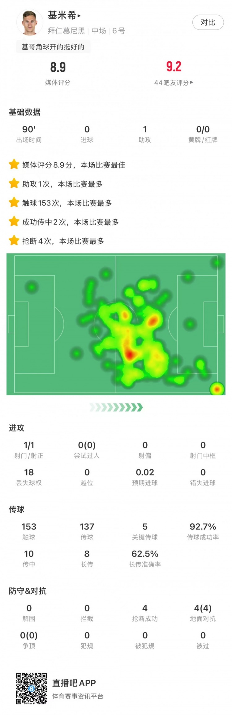 基米希全场数据:1次助攻,5次关键传球,评分8.9全场最高