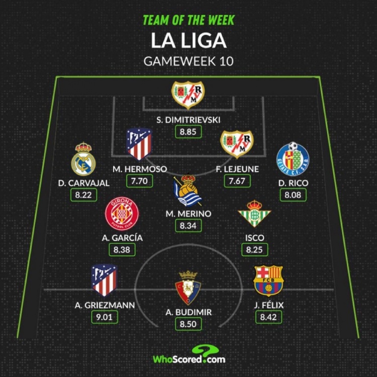 10月24日讯 WhoScored发布了西甲第十周的最佳阵容,菲利克斯、格列兹曼入选。