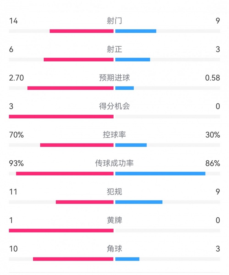 皇马51萨尔茨堡全场数据:射门149,射正63,控球率70%30%
