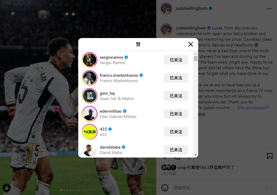 巴斯克斯将在今夏离开皇马,贝林厄姆社媒发文告别。河床17岁中场马斯坦托诺为贝林厄姆的这条社媒动态点赞。