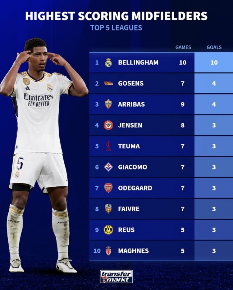 10月8日讯 德转统计本赛季五大联赛中场球员进球排行榜,贝林厄姆10球遥遥领先。