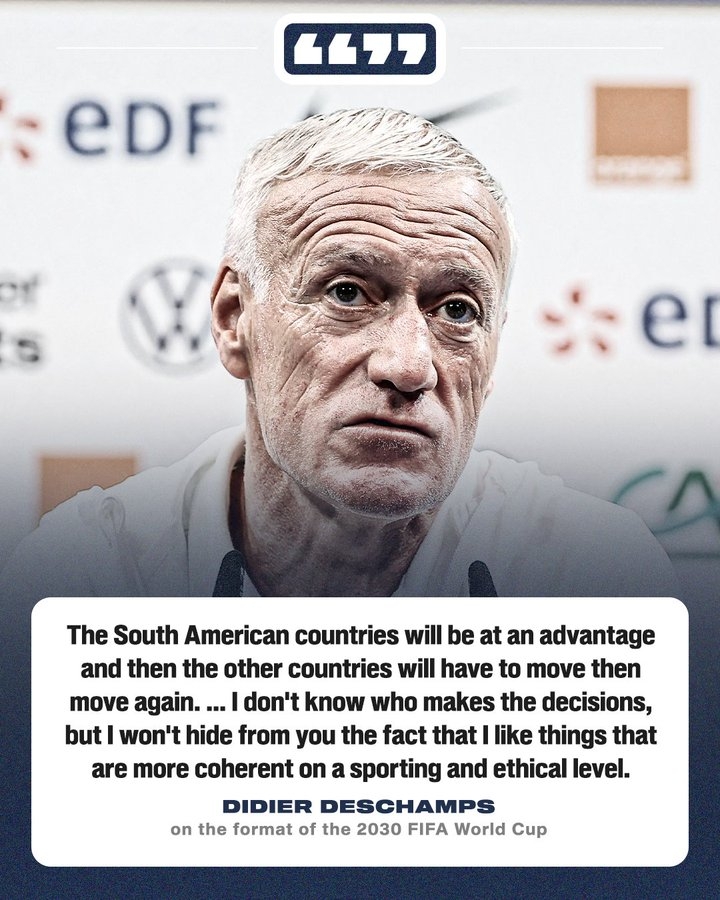 近日,法国国家队主教练德尚出席新闻发布会,在发布会上他谈到了2030世界杯的赛制。