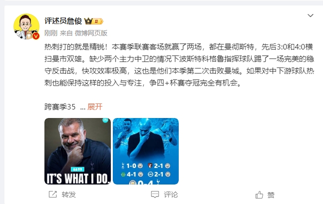 11月24日讯 本轮英超焦点战,曼城0-4不敌热刺。赛后,评述员詹俊发文点评。热刺打的就是精锐!本赛季联赛客场就赢了两场,都在曼彻斯特,先后3:0和4:0横扫曼市双雄。缺少两个主力中卫