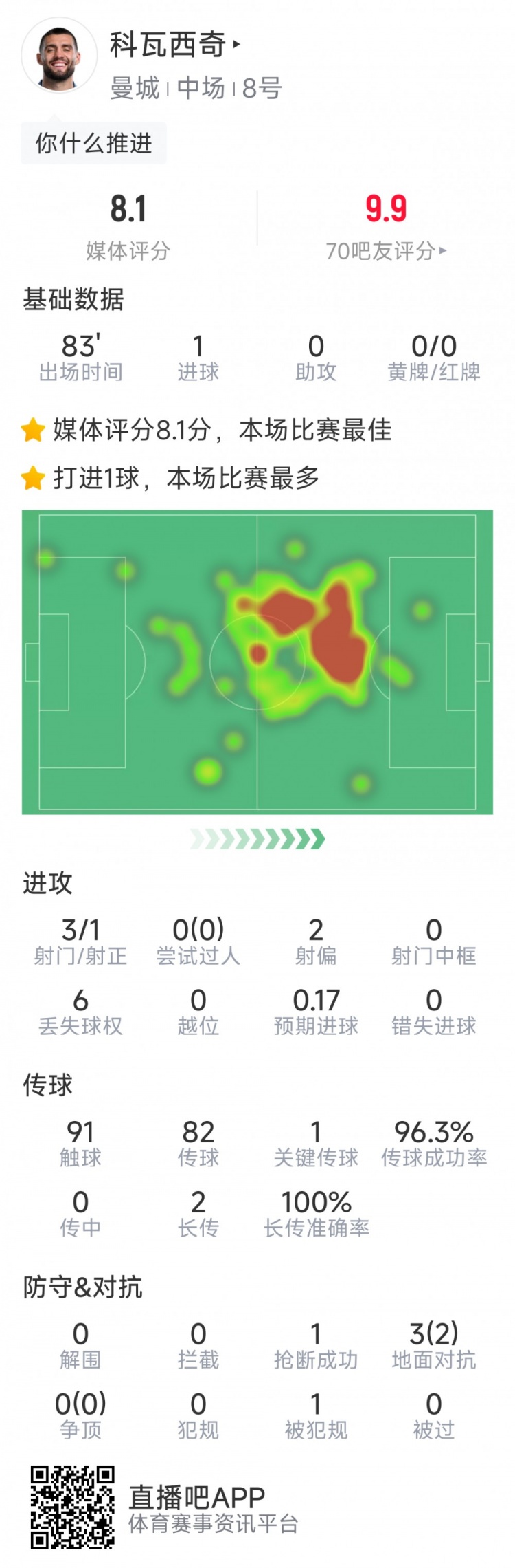打进关键扳平进球,科瓦西奇本场数据:1进球,3射1正,评分8.1分