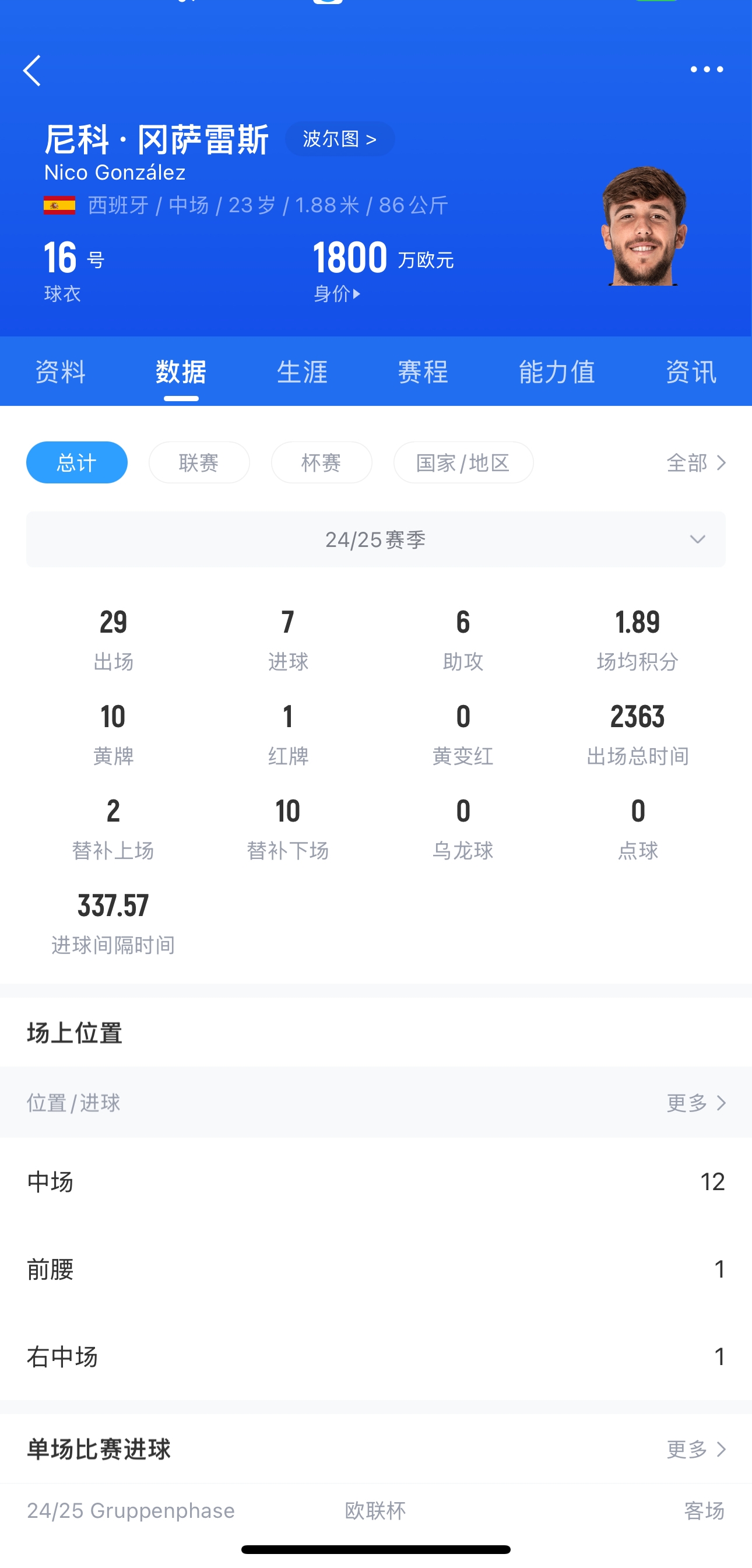 尼科-冈萨雷斯,现年23岁,西班牙中场,出自拉玛西亚青训,2023年夏窗波尔图花费840万欧签下球员,本赛季尼科代表波尔图出战29场比赛,贡献7球6助,目前球员德转身价1800万欧。