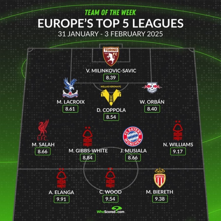 2月5日讯 本周五大联赛已经完赛,whoscored也统计了本周评分最佳阵容,诺丁汉森林4将在列。