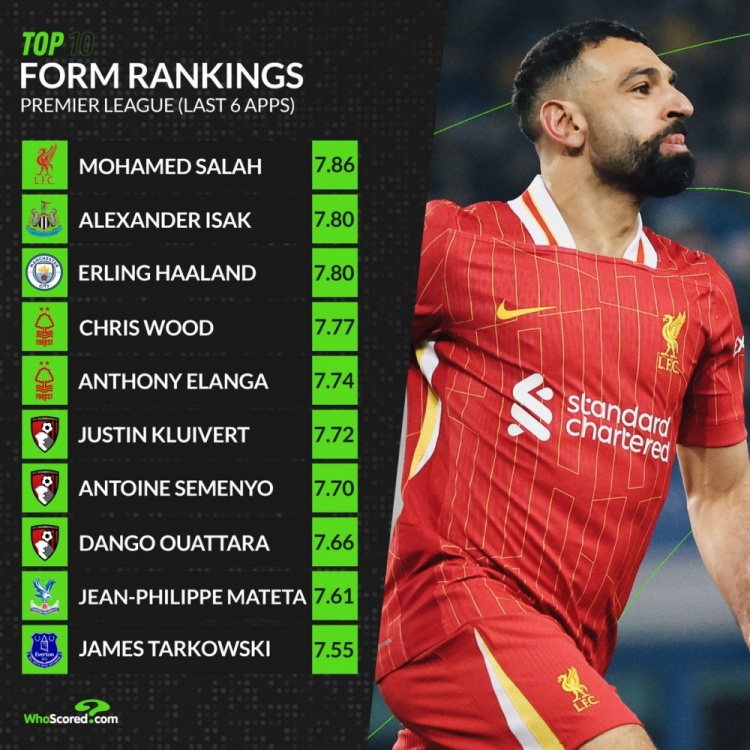 2月15日讯 数据结构whoscored统计了近6场英超场均评分情况,萨拉赫重返榜首。whoscored英超状态榜:7.86分,萨拉赫(利物浦)7.80分,伊萨克(纽卡)7.80分,哈兰德(曼城)7.77分,克里斯-伍德(诺丁