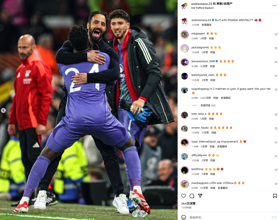 04月18日讯 曼联神奇5-4逆转里昂,晋级欧联杯四强。上一场轮休的奥纳纳本场重回首发,打满了全场。比赛最后时刻,曼联短时间内连入三球,坐镇后场的奥纳纳兴奋不已,狂奔至场边与阿莫
