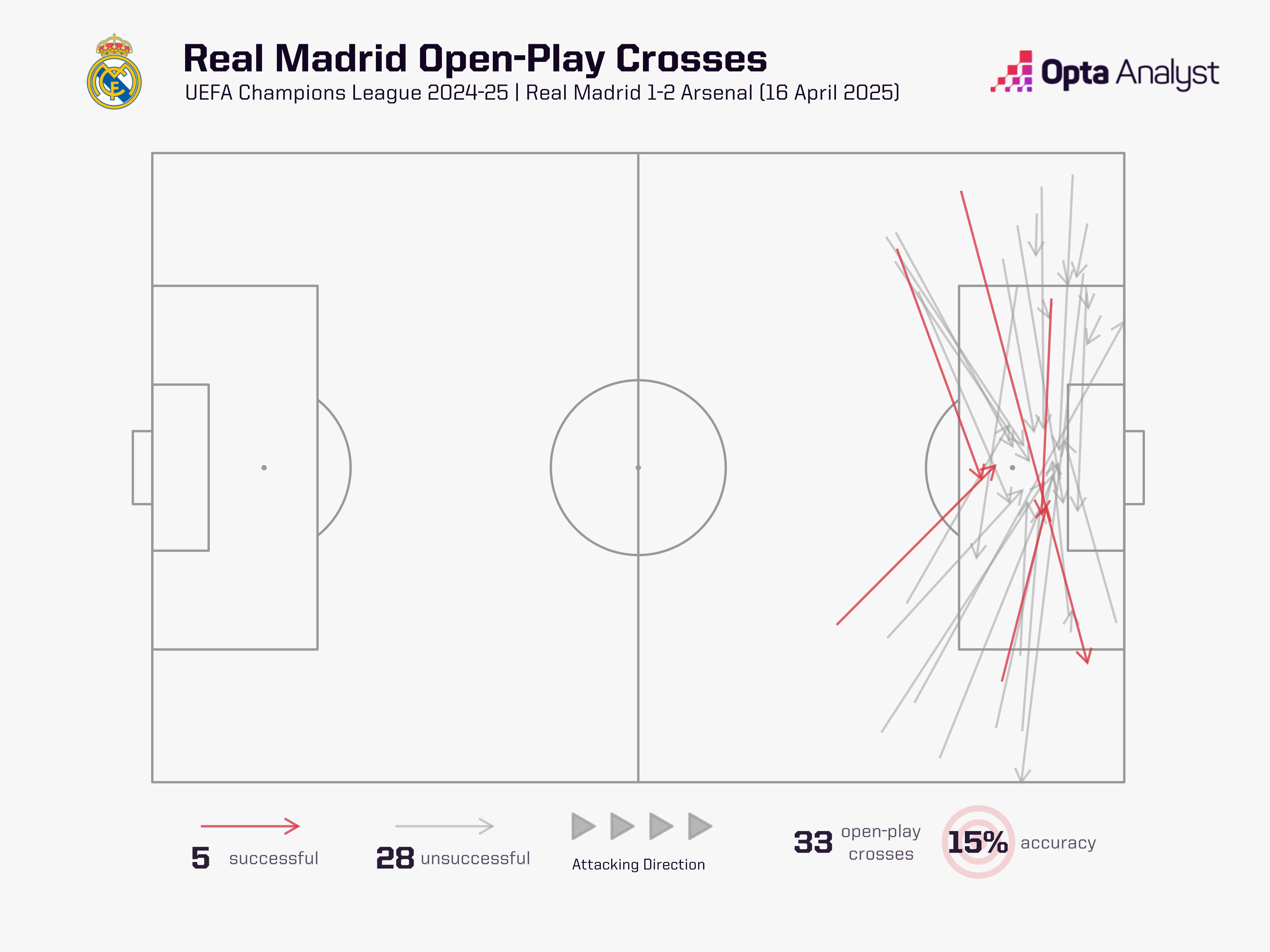 针对库尔图瓦的言论,数据机构Opta发布了一则数据统计。皇马在对阵阿森纳的次回合比赛中共尝试了33脚运动战传中,这一数据创造了他们近五年正式比赛的最多纪录。