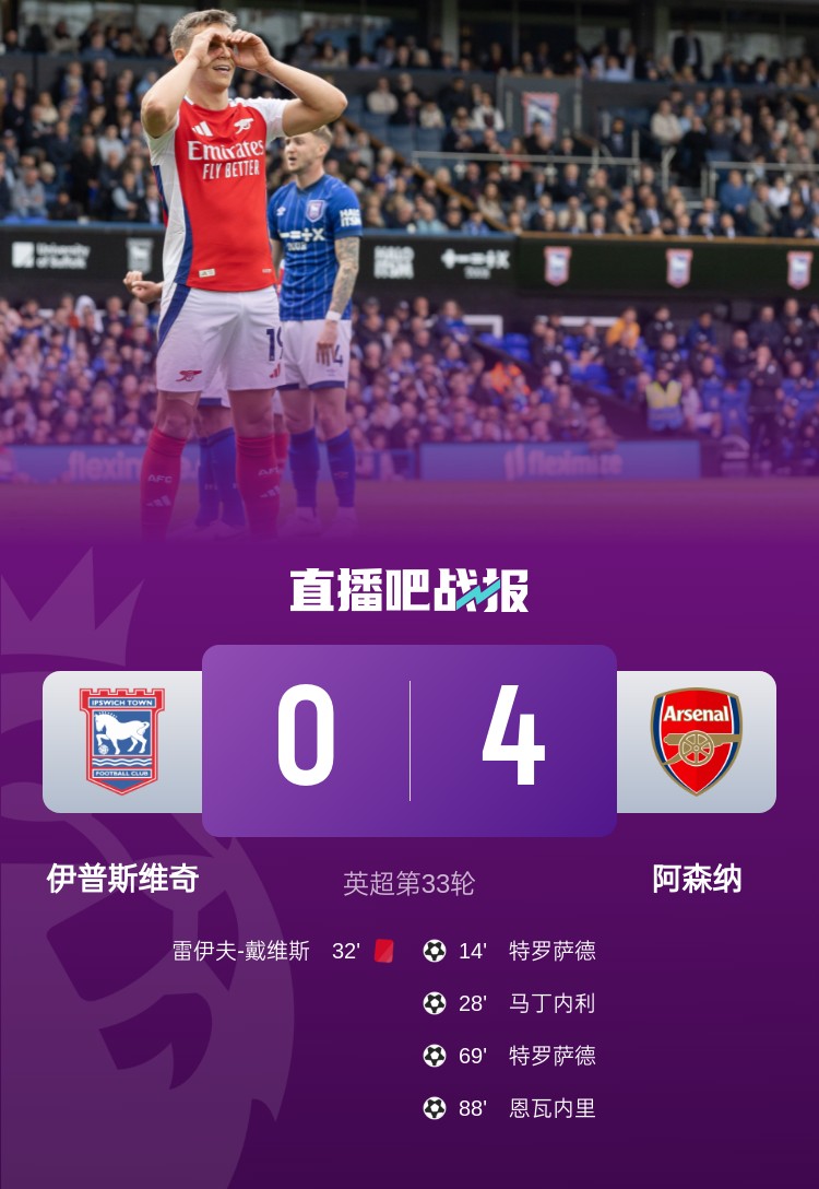 阿森纳4-0横扫伊普斯维奇,枪手方面特罗萨德双响,马丁内利、恩瓦内里破门。