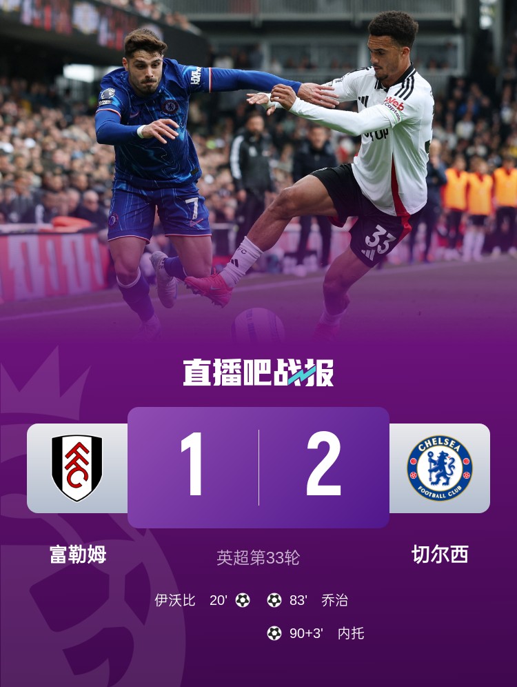 切尔西2-1绝杀富勒姆,乔治破门,内托第93分钟绝杀。