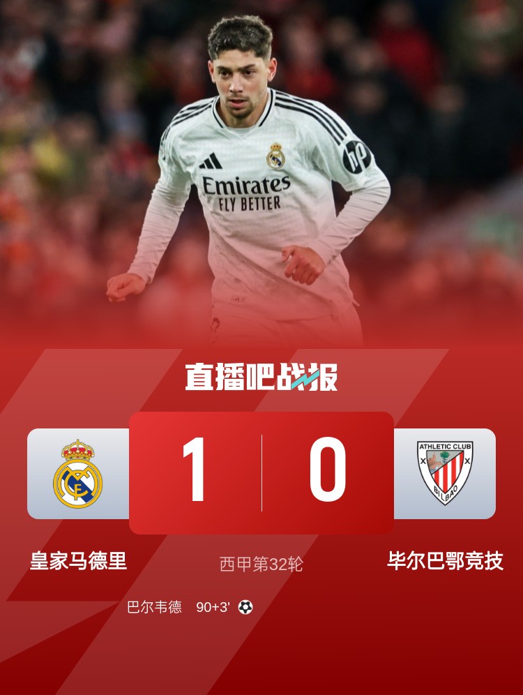 皇马1-0绝杀毕巴,巴尔韦德又一次用世界波为球队抢下宝贵3分。