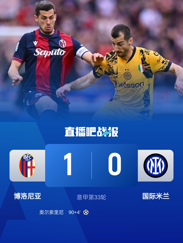 读秒遭绝杀!国米0-1博洛尼亚净胜球优势领跑 3天后意杯战米兰