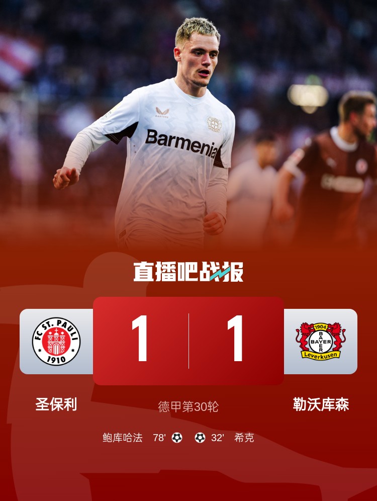 德甲-勒沃库森1-1圣保利距榜首8分 希克头球破门格里马尔多献助攻