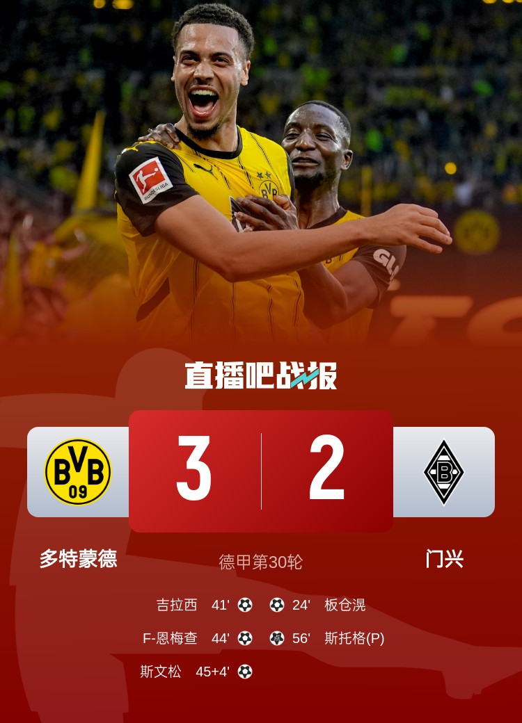 多特3-2击败门兴,吉拉西、恩梅查和斯文松各打入一球。