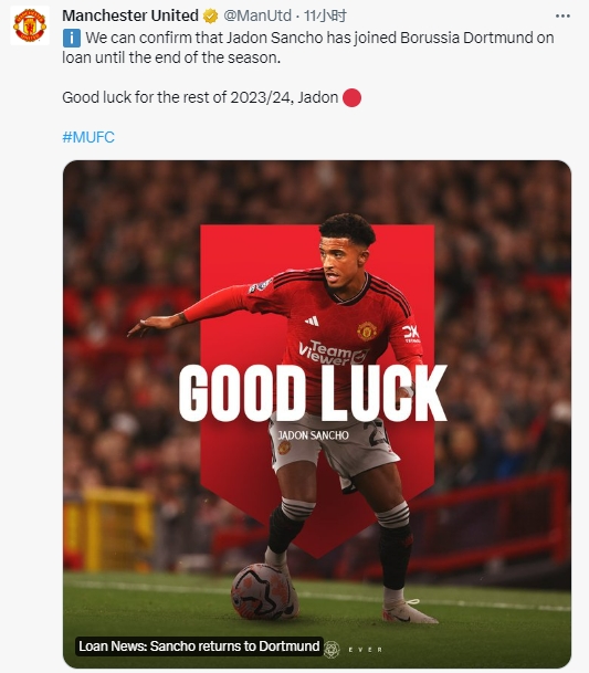 曼联官方在社媒写道:“我们可以确认桑乔已经租借加盟多特蒙德至赛季结束,祝愿2023-24赛季剩下的时间里一切顺利,杰登。”在该官方公告下,曼联球迷有人表达不满,也有人送上祝福。