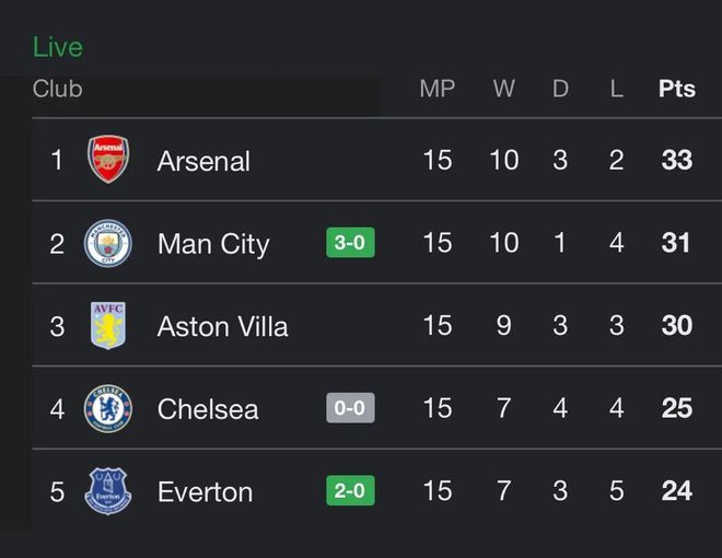 英超15轮过后,联赛的争冠格局发生巨变。在今晚进行的英超比赛中,领头羊阿森纳1-2惨遭维拉绝杀,曼城则3-0轻取桑德兰。在积分榜上,近3轮仅1胜的阿森纳以33分领跑英超。曼城三连胜