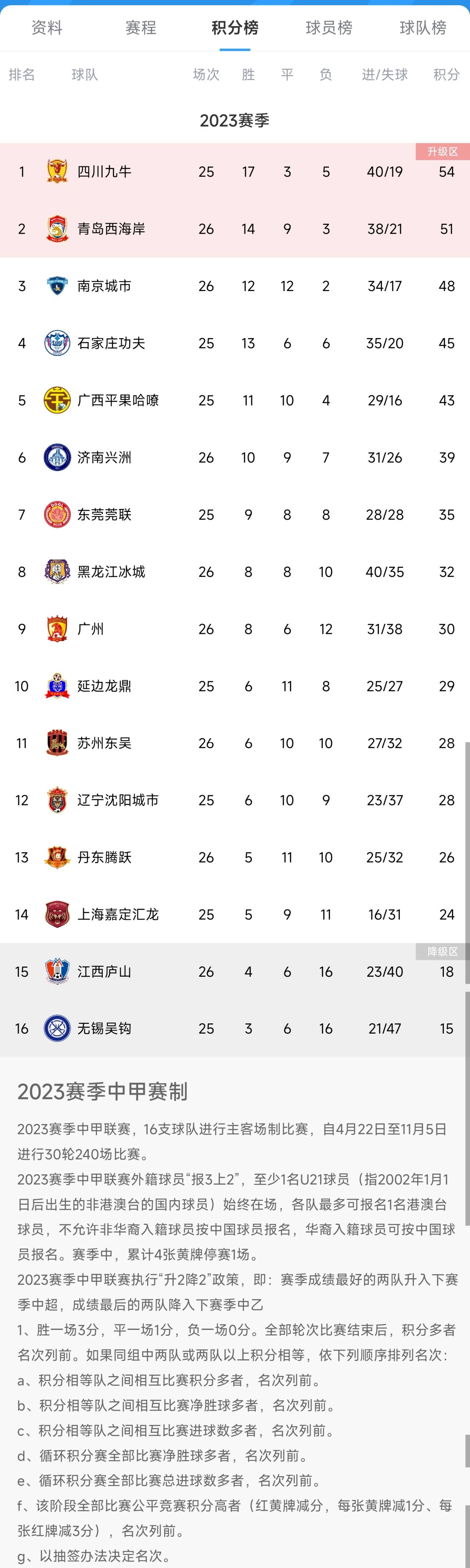 而江西庐山9轮不胜,距离保级区还差6分,濒临降级。