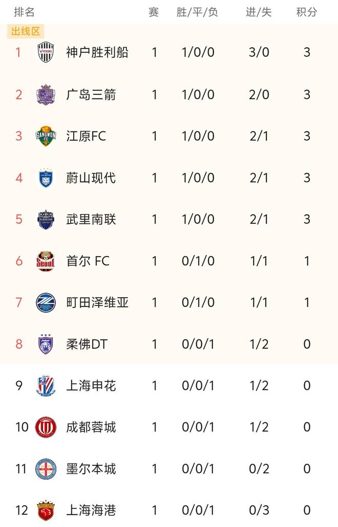 首轮过后的积分榜,5支拿到首胜的球队同积3分,神户胜利船凭借着3个净胜球的优势排在榜首,广岛三箭位居第2,均只有1个净胜球的江原FC、蔚山HD以及武里南联分列第3至第5。同积1分的首尔FC以及町田泽维亚排在第6和第7。