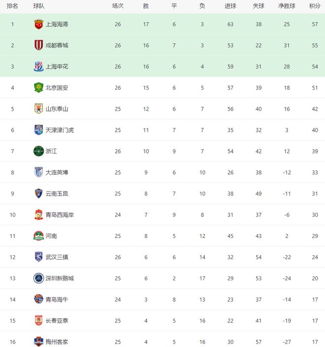 上海海港积57分,反超积55分的成都蓉城,重返榜首位置,上海申花积54分继续排名第三,北京国安终结三连败之后,积51分仍排第四位。