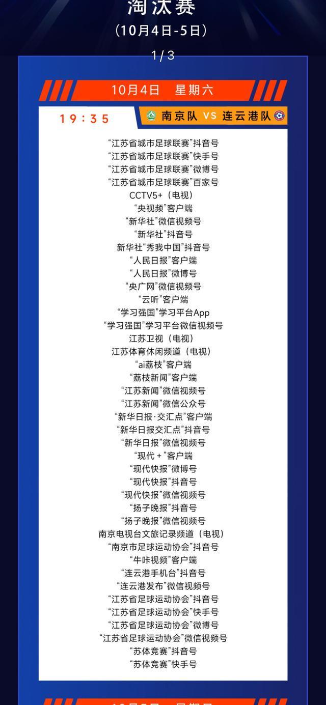 现代快报讯(记者 王卫)10月4日、5日、7日、8日,苏超八强淘汰赛将在国庆中秋双节假期期间激战四场。10月3日,苏超官方微信公众号发布了淘汰赛(10月4日-5日)转播计划表,现代快报记者注意到,10月4日晚南京对阵连云港、10月5日晚徐州对阵泰州的比赛,CCTV5+(电视)均转播。记者了解到,这是央视电视端首次直播苏超赛事。