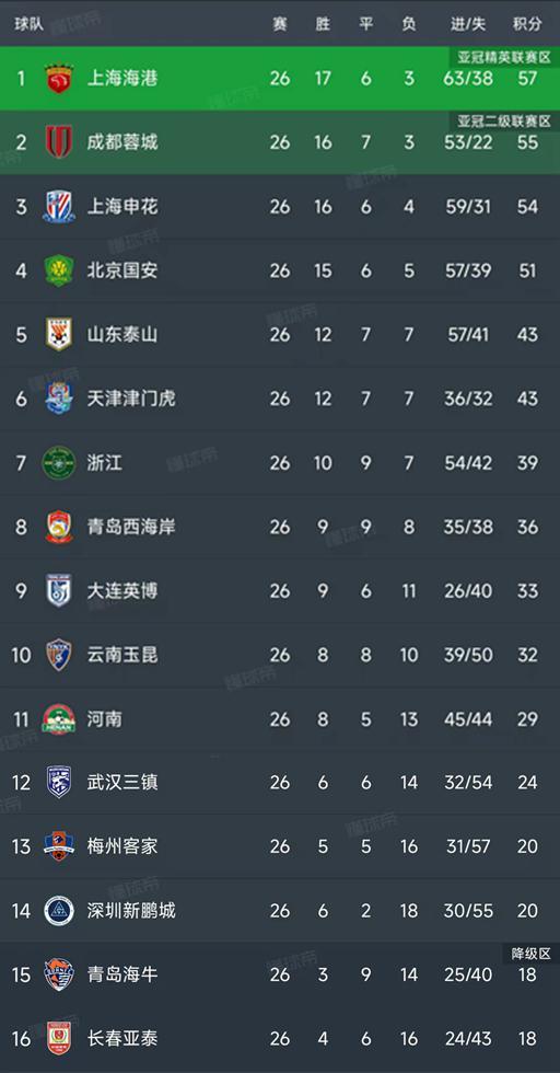 北京时间10月7日,随着三场补赛的结束,目前的中超所有球队都已经踢完了26场比赛,争冠和保级逐渐明朗,其中争冠的是海港57分,蓉城55分,申花54分。为保级而战的球队是梅州客家,深圳新鹏城(20分)、青岛海牛和长春亚泰(18分)!