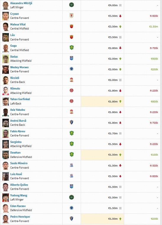 中超球员身价榜:米特里策居首,克雷桑第二,王钰栋第19